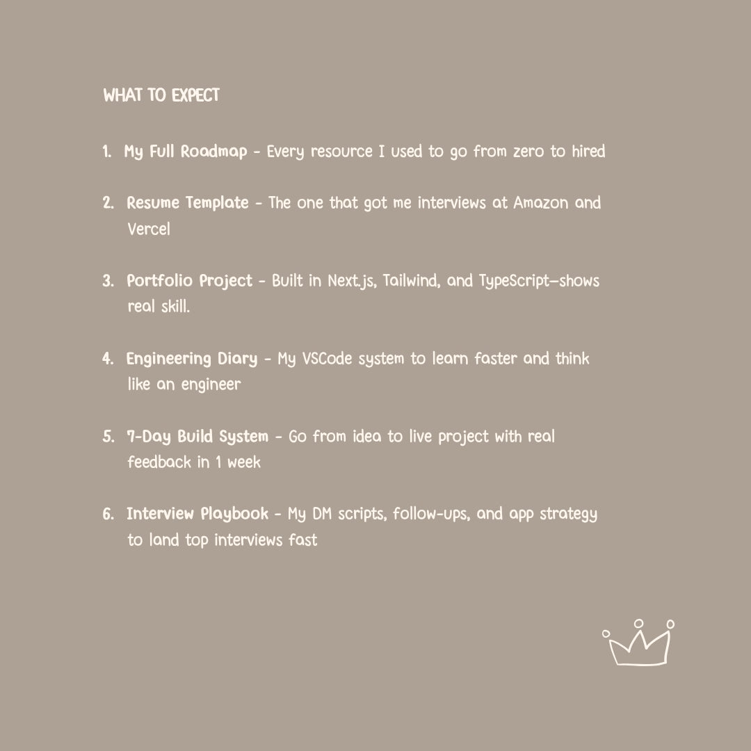 Unlock the complete toolkit Miraya used to go from self-taught beginner to landing interviews at Amazon, Vercel, and more.